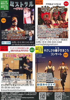20日(土)は、【ソリダリティ 未来へ】前半、ともしび音楽企画「ふーちゃんらんど」(ミュージックベルとパネルシアター:幼児から大人向け)、後半、総合企画アトラス「中川美保サクソフォンコンサート」で、クリスマス特別合同ライブも企画しています。